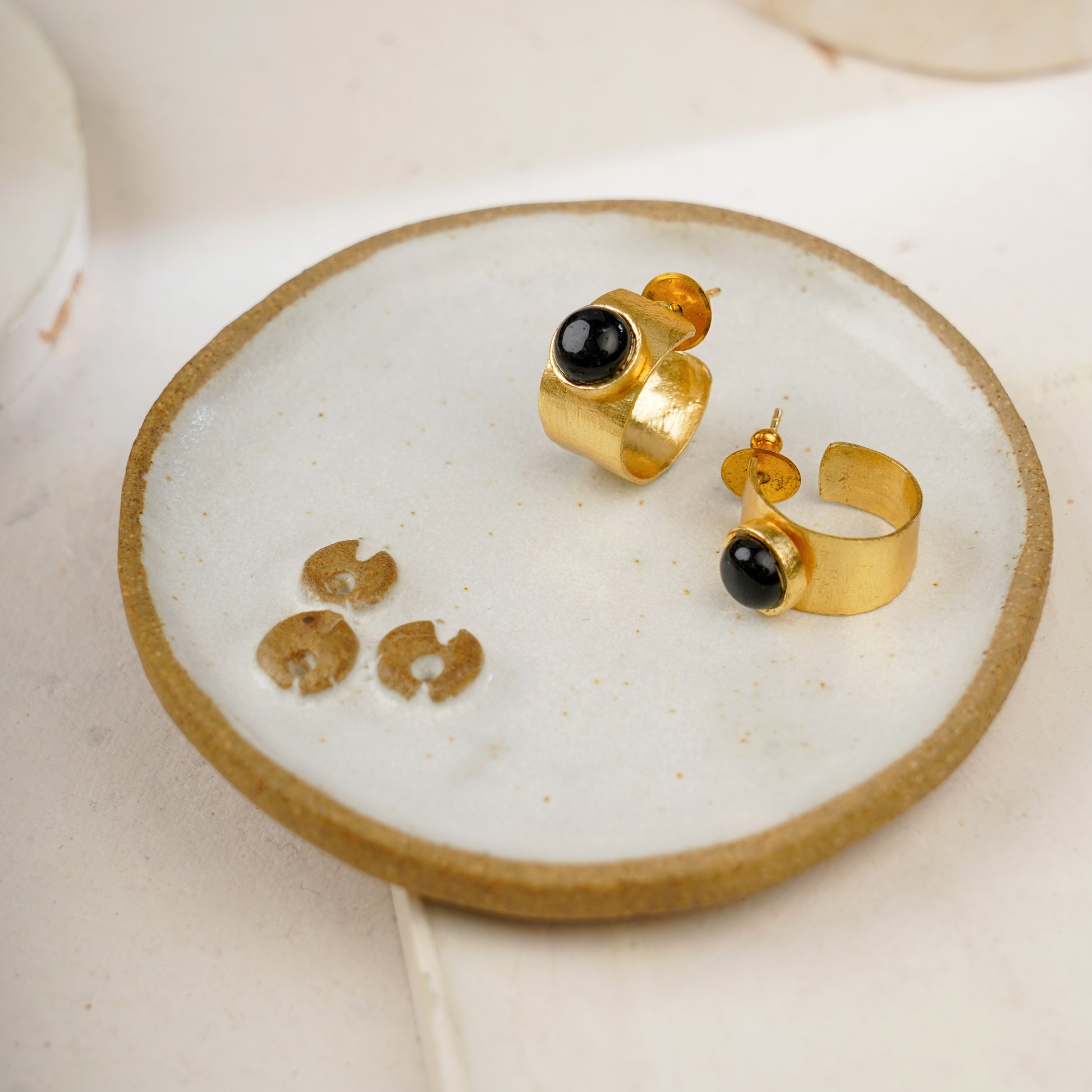 Elevate your style with these black stone adorned Gold Finish Brass earrings. Expertly handcrafted with high-quality materials, they are versatile and hypoallergenic for a comfortable and personalized look. Same-day shipping available.