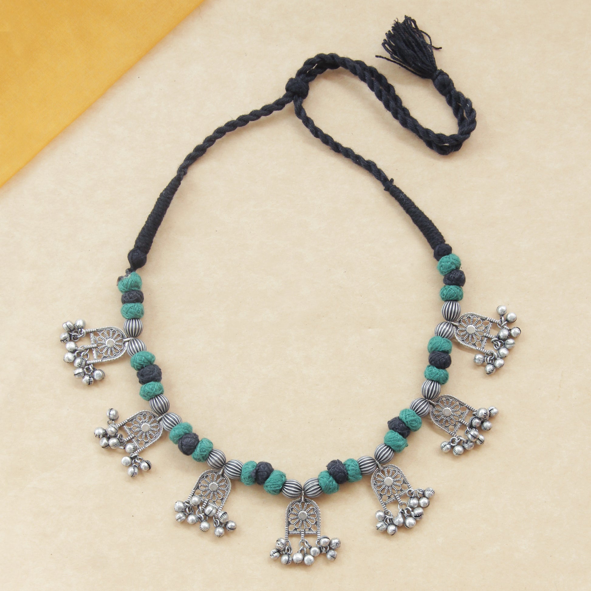 This necklace combines handwoven thread elements with stunning German silver motifs, creating a timeless accessory ideal for any occasion.