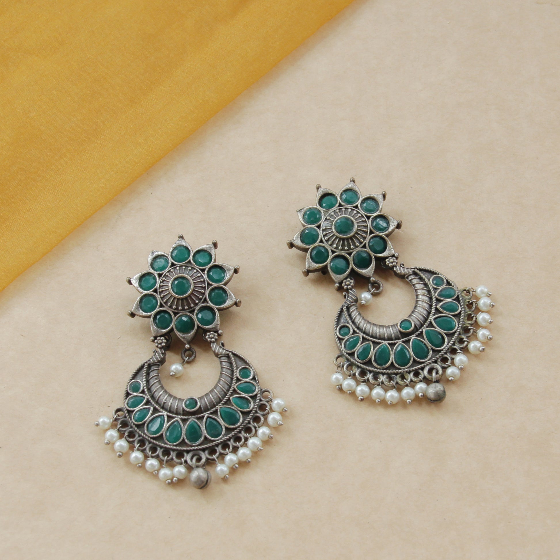 Elevate your ethnic style with these oxidized silver jhumka earrings featuring green stones, golden accents, and delicate bell charms. Perfect for festive occasions, these statement earrings blend tradition and modern craftsmanship.