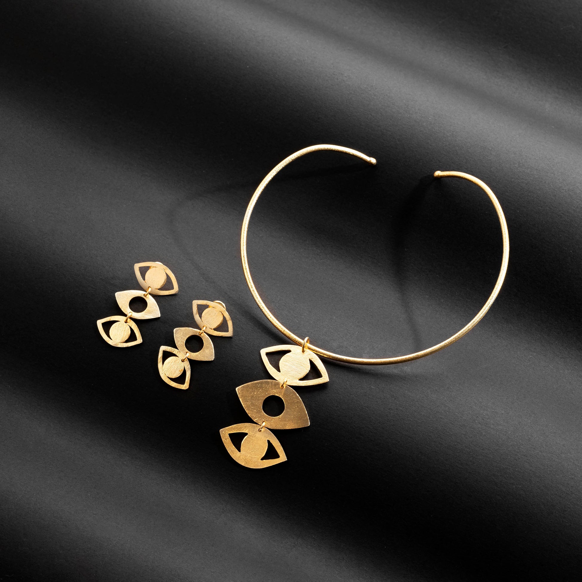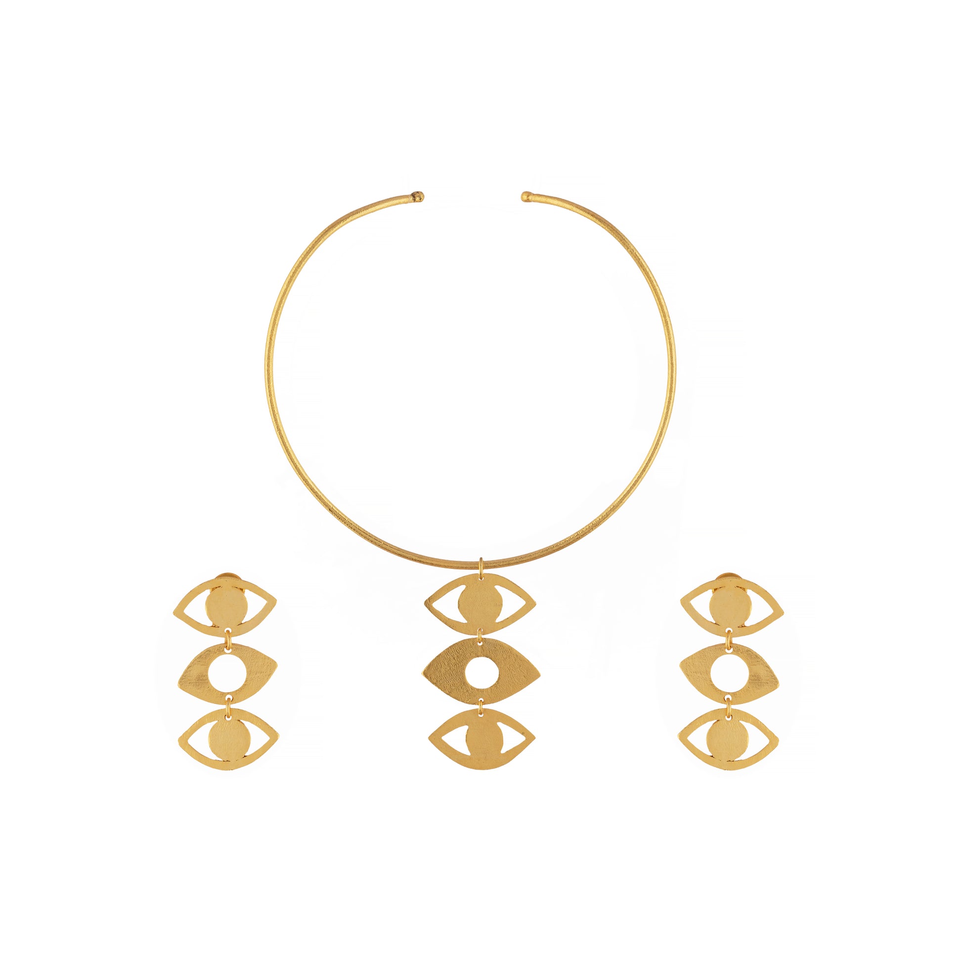 Gold plated brass necklace with 3 eye pendants for protection. Includes matching earrings and care instructions. Made from hypoallergenic materials for durability. Store in a dry place to maintain quality.