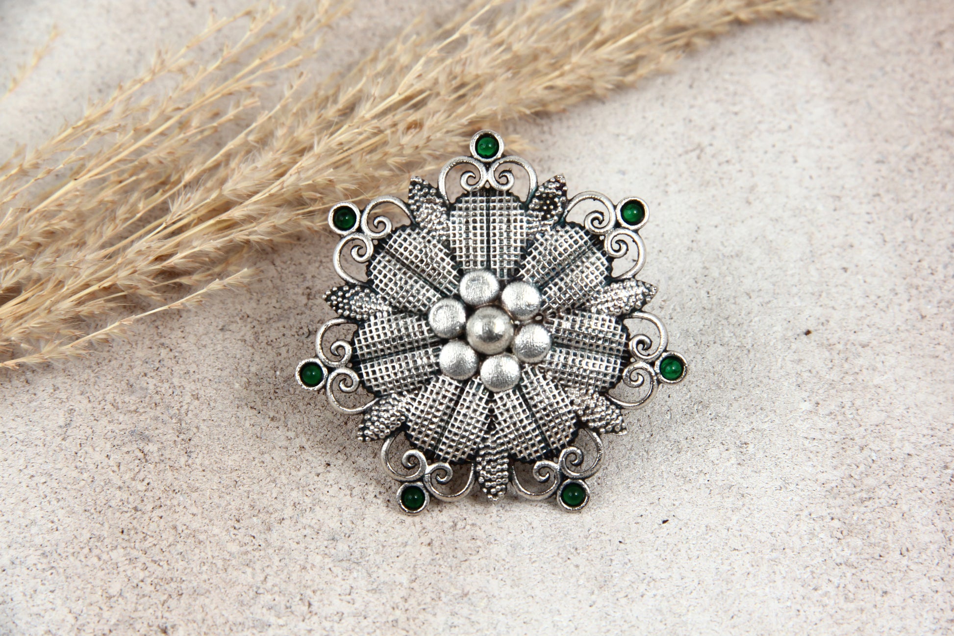 Adjustable German silver ring, handcrafted with brasshetic stone and synt closures. Spot clean and store separately, avoid contact with fragrance and water. Diameter is 5cm, comes in a ring box. Variations may occur.